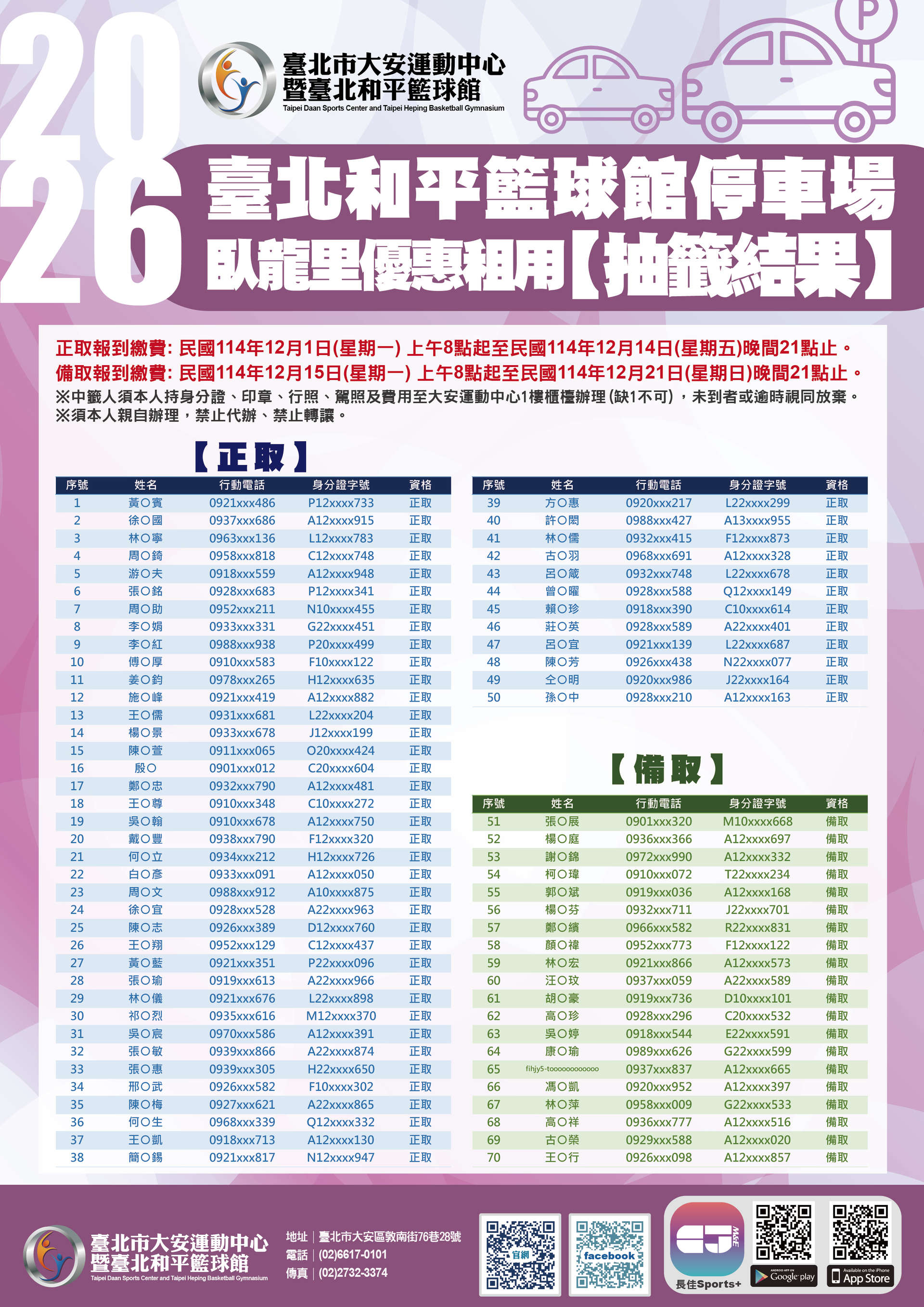 【公告】臺北和平籃球館停車場臥龍里優惠租用-抽籤結果